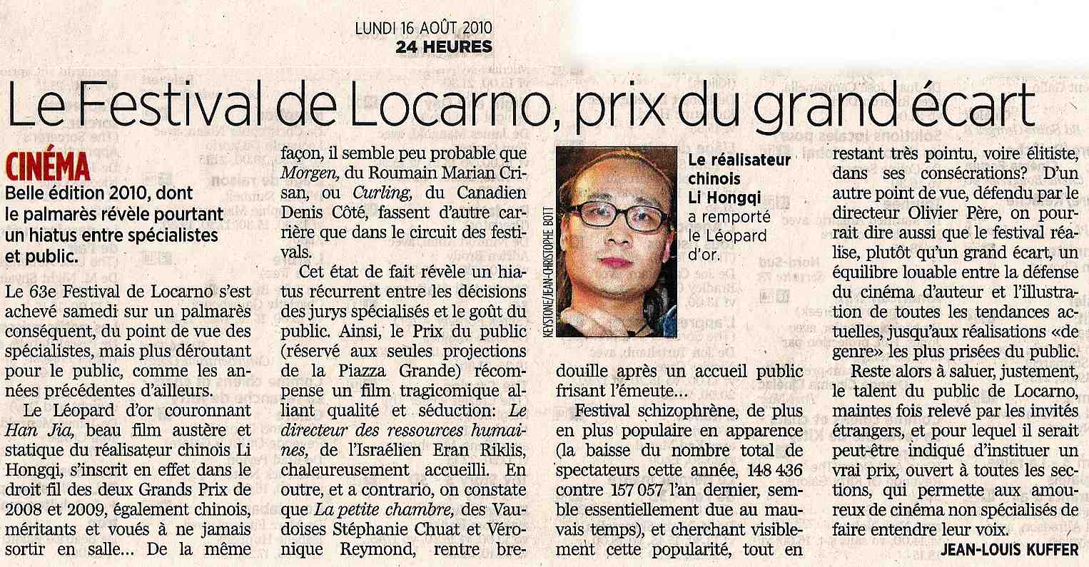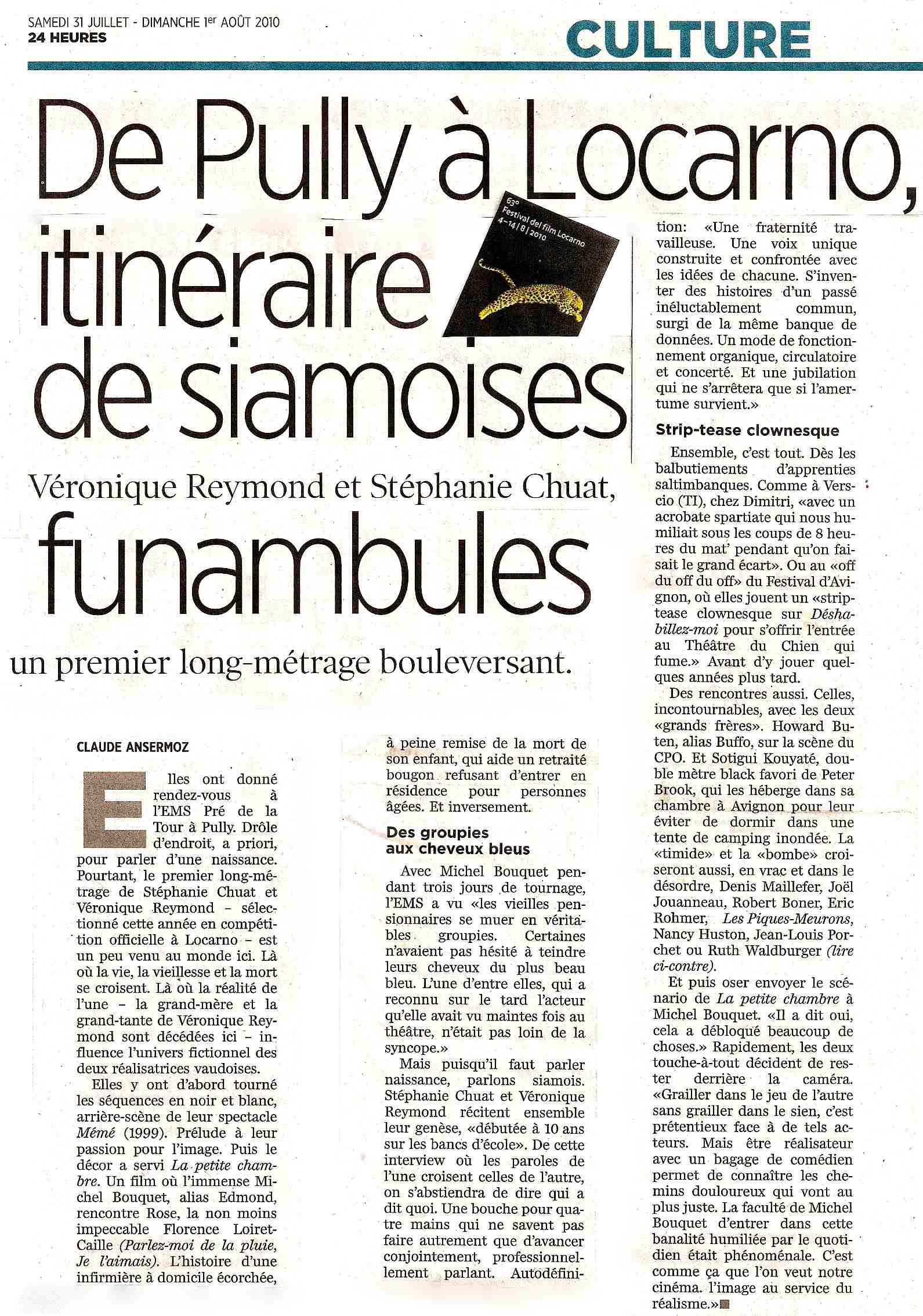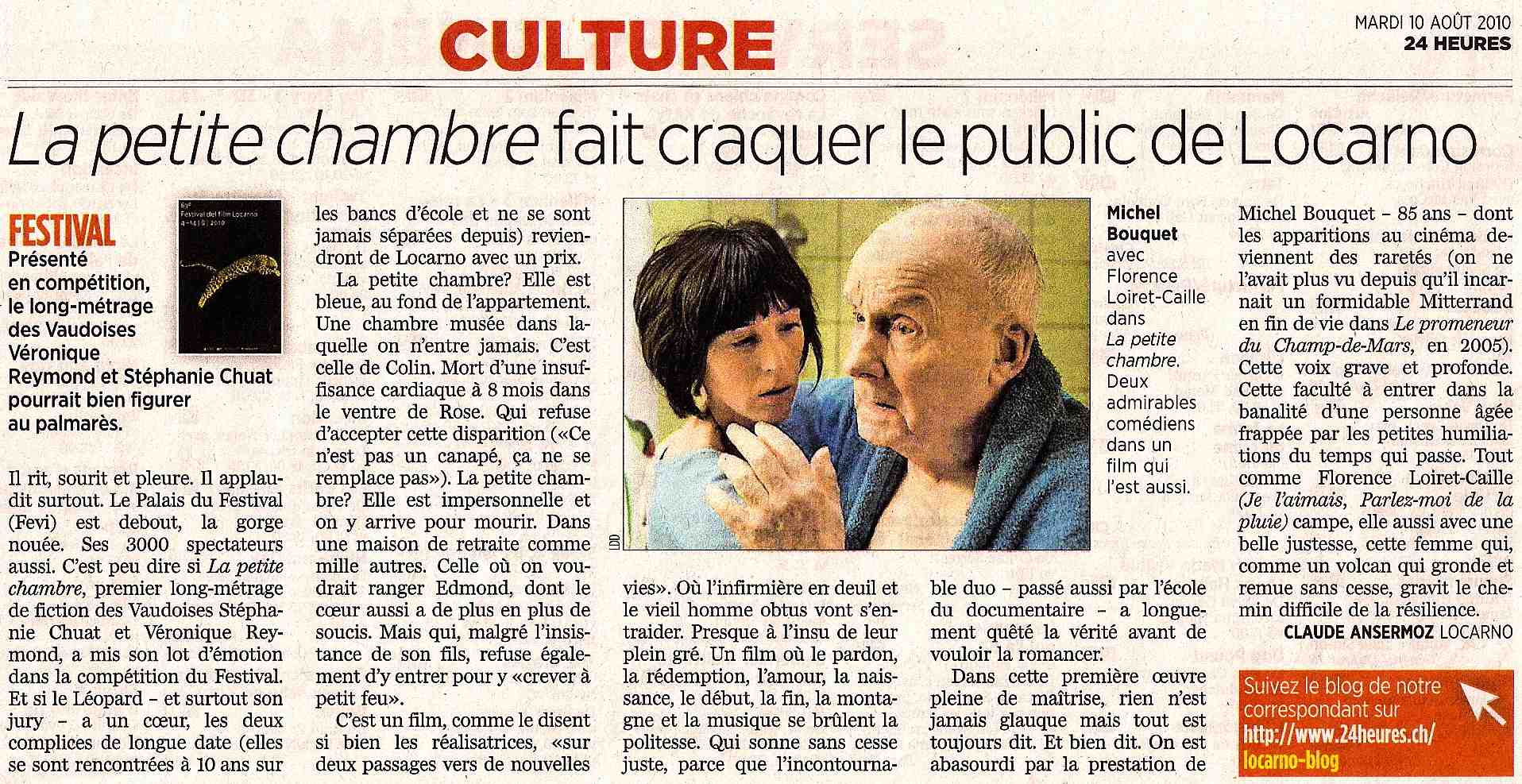 La petite chambre à Locarno – revue de presse 1/2 Articles de la presse romande Journal 24 Heures Pardo News 24 Heures Film la petite chambre